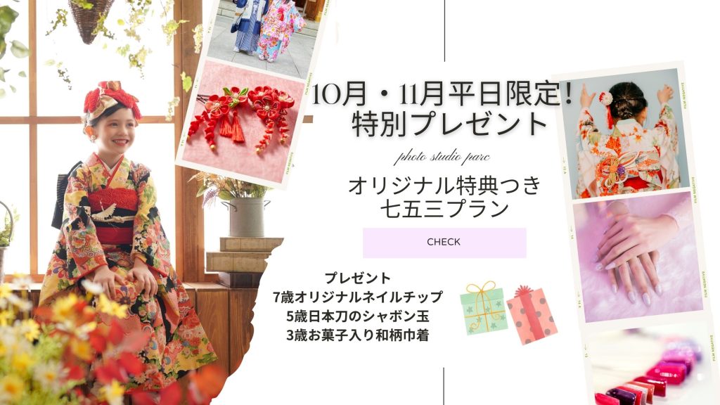 フォトスタジオパルクでは、10月・11月の平日に七五三撮影をご利用いただいた方へ、年齢に合わせたオリジナルのプレゼントをご用意しました。