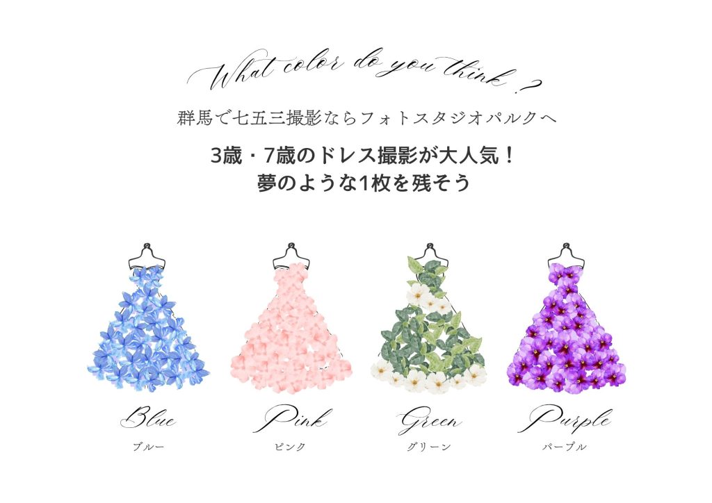群馬県高崎市にある当スタジオでは、3歳・7歳のお子さま向けに可愛いドレスを豊富にご用意しています。