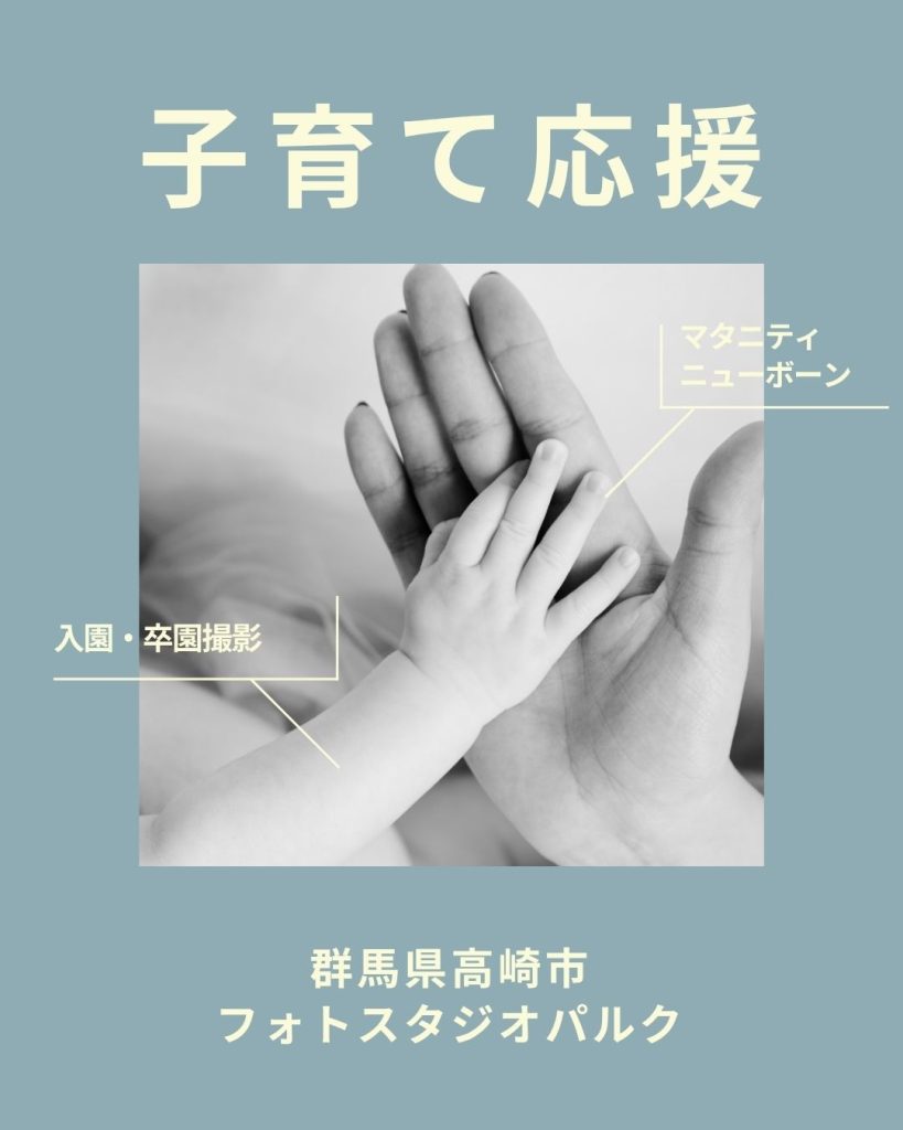 群馬県高崎市の写真スタジオ「フォトスタジオパルク」は、群馬子育て応援事業の対象店舗です。子育て世代を応援する特別キャンペーンとして、マタニティ撮影・ニューボーンフォト・入園・卒園撮影を無料で体験いただけます🎁