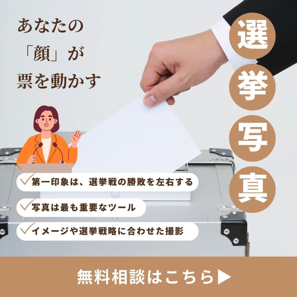 ポスター・リーフレット・選挙公報・Webサイト・SNSなど、あらゆる媒体に使用される 選挙用写真 は、候補者の「信頼」「清潔感」「誠実さ」を有権者に伝える最も重要なツールと言えます。